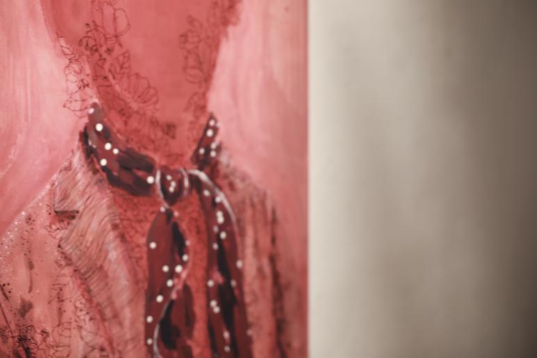 Prezentowane w Kolonii Artystów cztery obrazy utrzymane są w konwencji renesansowego portretu, którego schematyczność przełamana zostaje aktem wyeliminowania z pola widzenia Odbiorcy twarzy postaci, co nadaje przedstawieniom wyjątkowo dwuznaczny wyraz. Malarska gra pozorów sprawia, że portret – paradoksalnie - zaprzecza sam sobą zasadom portretu. Gra konwencją ujawnia się tu również na poziomie malunku: typowa dla przedstawień portretowych zwarta kompozycja zostaje zaburzona przez szeroki gest z jednej strony i mocno zaznaczony szczegół - z drugiej. Dominują odcienie nasyconej czerwieni – barwy alarmowej, stawiającej w stan gotowości, budzącej poczucie zagrożenia. Jeden z mianowników wizualnych łączących cykl stanowi również motyw roślinny – na jednym z portretów bujna roślina umieszczona zostaje w miejscu serca i rozrasta się niczym układ krwionośny. Również tam, gdzie nagie ciało nastawia się na razy, zauważyć można kiełkujące życie.