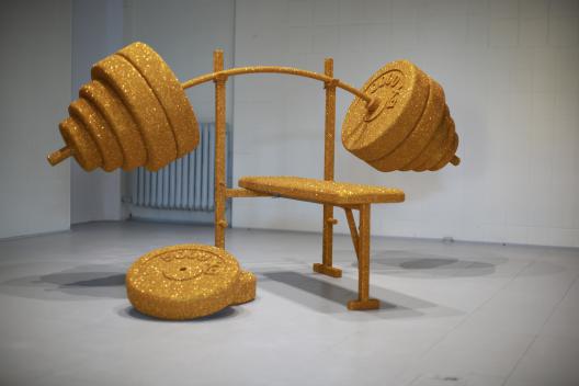Truizm i problem tożsamości wydają się tematycznym centrum wokół którego powstało STO TON Przemysława Trześniaka. Posługując się estetyką przesady, precyzyjnie i z nieszlachetnych materiałów, autor wytworzył artefakt, który mógłby znależć się na witrynie sklepowej lub w korytarzu budynku siłowni fitness. Wyraźna inspiracja dziełami sztuki masowej XX I XXI wieku, nasuwa mi skojarzenie z przeskalowaną satuetką konkursową.